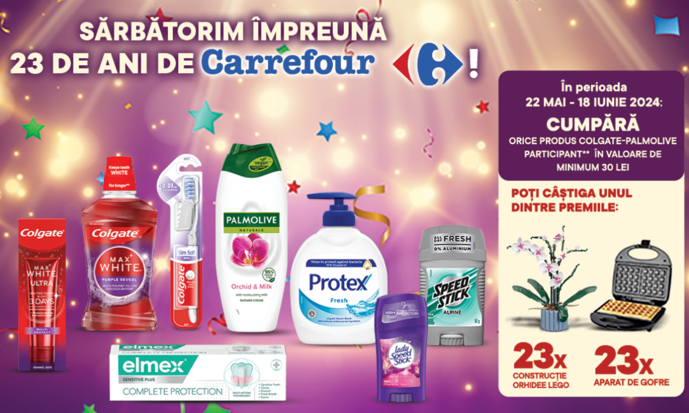 - Achizitioneaza produse Colgate sau Palmolive de min. 30 lei din magazinele Carrefour
